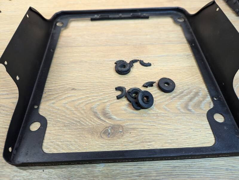 Installation of the feet on the Imperial Good Companion can be a bit scary for less experienced typewriter users. The body shell needs to be taken off the machine to install the nuts that hold the machine to the base on the rear feet. The internals of the machine are in the way when you try to install them without taking the shell off first.